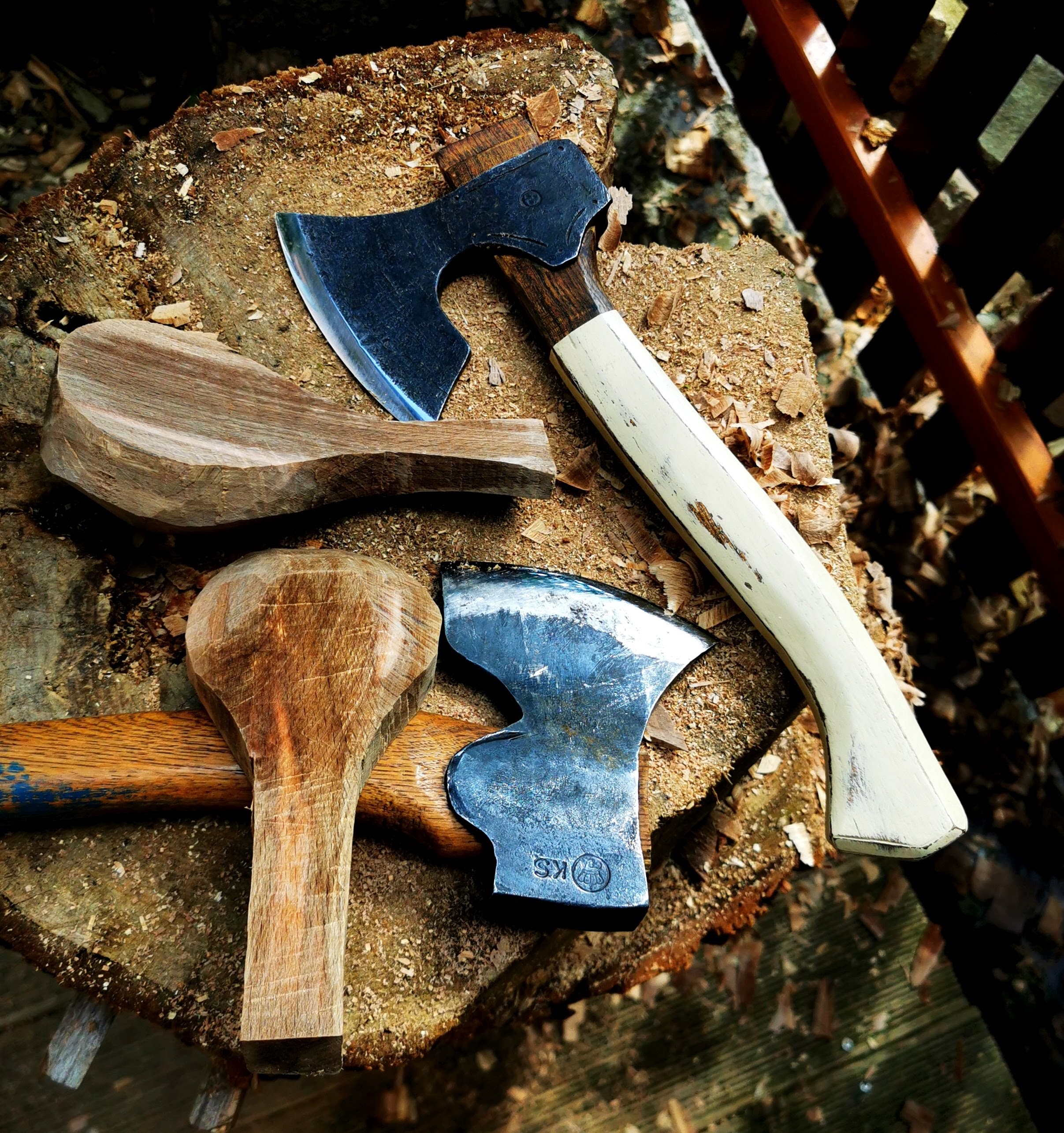 I am lucky that our summer has been a rather wet one to date and that my wood stash has not been in any danger of drying out. The bagged rounds and split billets have a perfect moisture level which makes for good carving even in this hard drying beech wood. It is another reason I am doing so many of these scoops before the consistency of the wood changes.