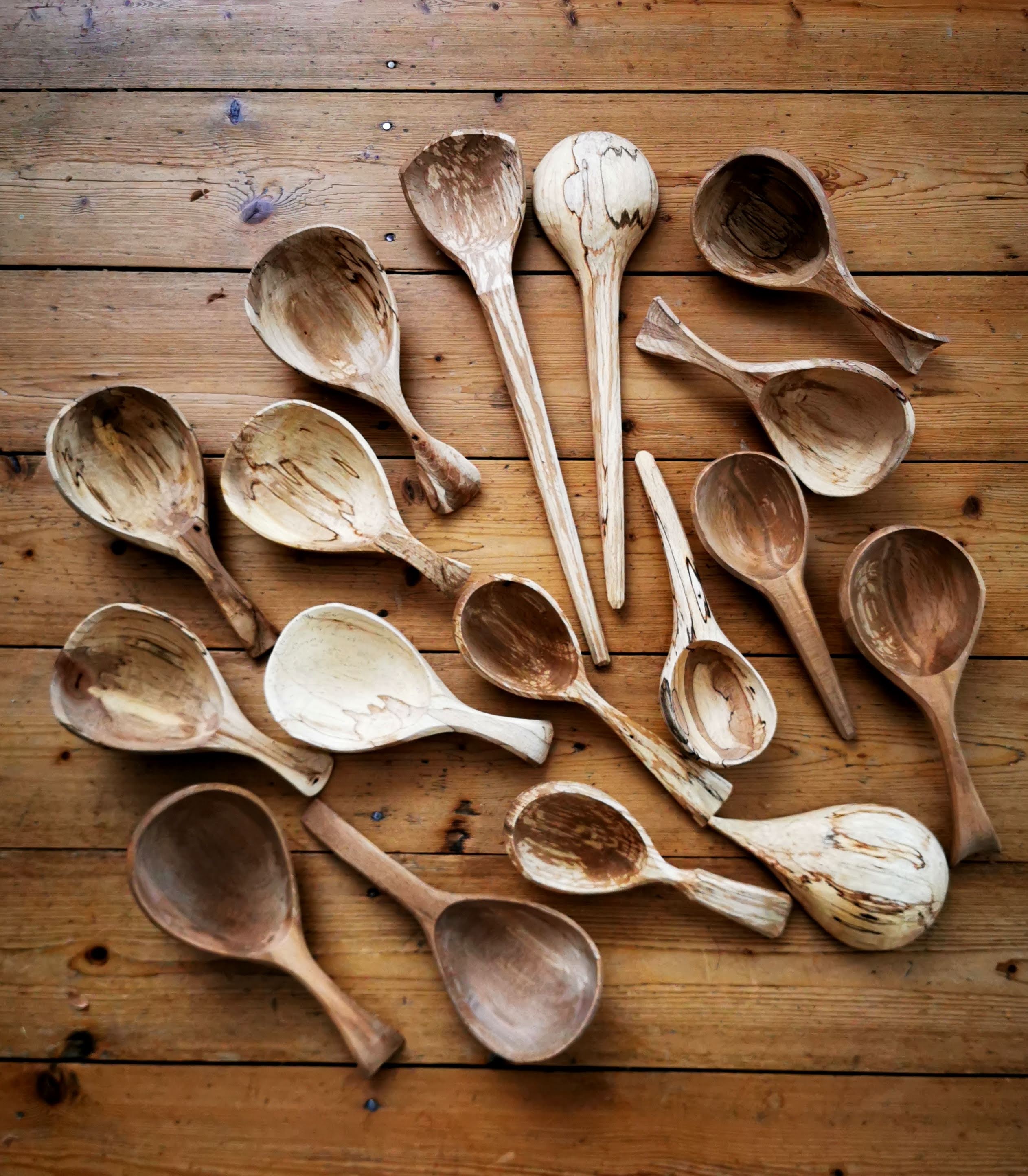 Now I am waiting for one of those hot sunny summer days when I will take the lot of dry scoops outside, give them an oil treatment and let the sun cure them with light and heat. That should let the spalted grain patterning pop and show off their unique look. Market ready is the plan … whether the market will happen in the current pandemic scenario is still up in the air but I am hopeful.